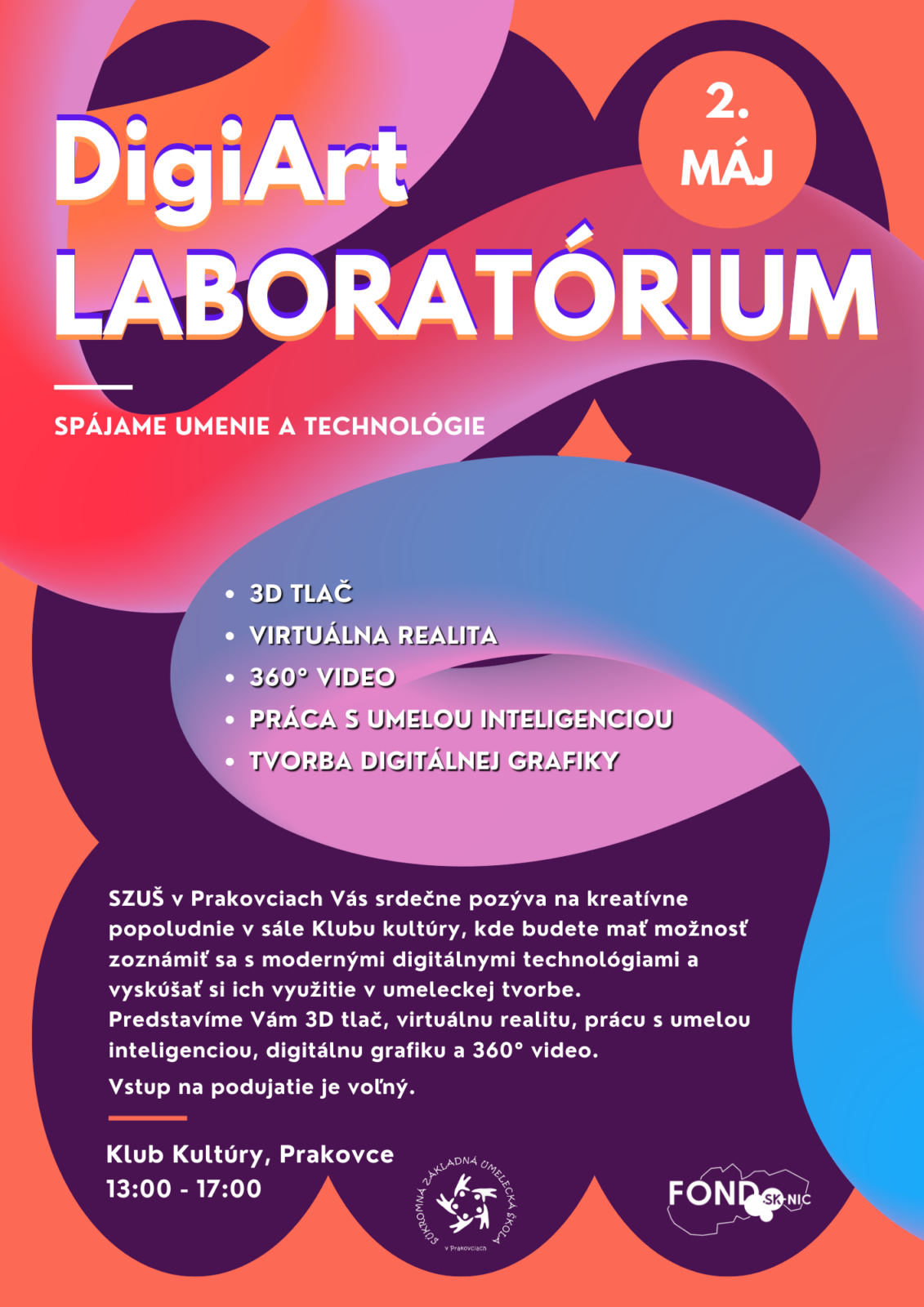 Podujatie sa uskutoční v sobotu 2. mája od 13:00 do 17:00 v sále Klubu kultúry v Prakovciach. Návštevníci budú mať možnosť zoznámiť sa s tým, ako sa dajú súčasné digitálne technológie využiť v umeleckej tvorbe, vzdelávaní aj pri rozvíjaní tvorivého myslenia.
